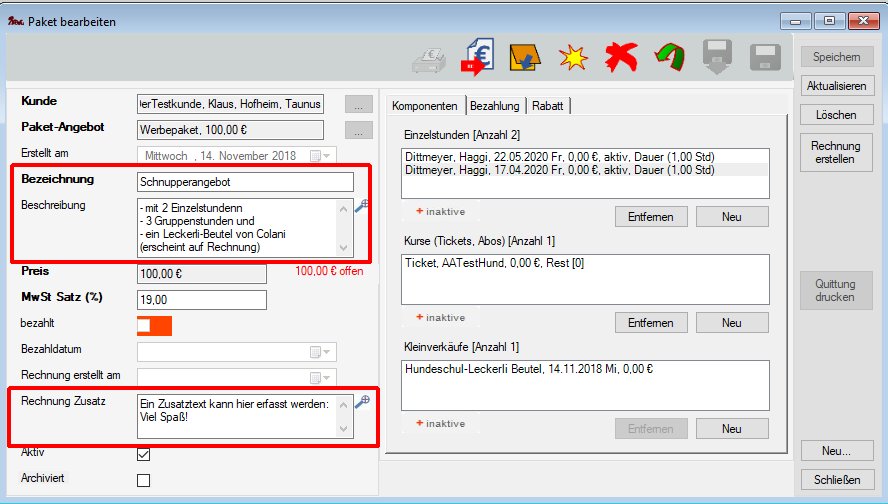 Es wird empfohlen, Bezeichnung und Beschreibung eines Paketes so zu formulieren, dass für den Kunden ersichtlich ist, was das Paket enthält. Bezeichnung, Beschreibung und Rechnung Zusatz können zur Formulierung des Textes für die Rechnungsposition verwendet werden.