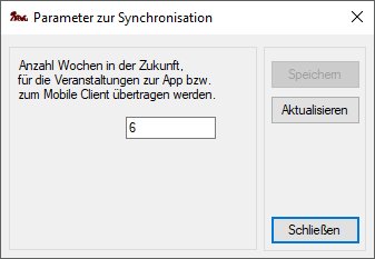 Kursdaten werden immer eine Woche in der Vergangenheit und für eine bestimmte Anzahl von Wochen in der Zukunft zur KnoWau App übertragen. Die Anzahl Wochen in der Zukunft können sie über den Menüpunkt "Datei->Parameter zur Synchronisation" einstellen. Dabei sollten sie die Zahl nur so groß wie tatsächlich benötigt wählen, um potentielle Synchronisation-Konflikte zu minimieren.