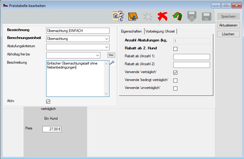 Die Preise richten sich nach Übernachtung, (Halb-)Tagesbetreuung und stundenweise Betreuung. Die Preise können flexibel an Gewicht, Größe, Anzahl Tage, Anzahl Gäste oder Verträglichkeit gebunden werden. Bei Installation sind Preisbeispiele vorkonfiguriert, die man anpassen oder löschen kann.
