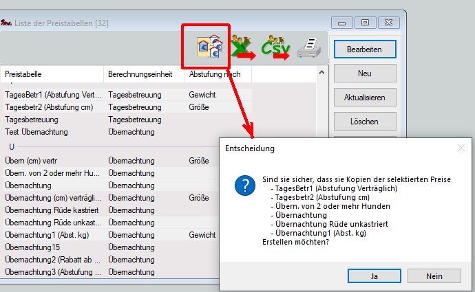 Nach Bestätigung werden die Preise kopiert und erhalten im Namen den Präfix (Kopie), aus Übernachtung wird (Kopie) Übernachtung.