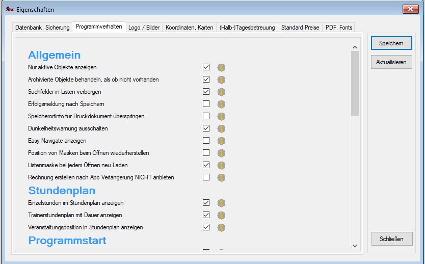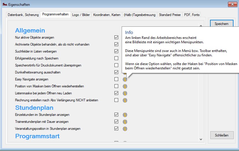 Einstellungen, Software anpassenWeitere EinstellungenEigenschaften Programmverhalten Reiter Programmverhalten: Mit diesen Eigenschaften können sie das Programmverhalten ihren individuellen Anforderungen anpassen. Die Bedeutung der einzelnen Felder wird beim Überstreichen des Info Icons rechts neben dem jeweiligen Feld angezeigt: