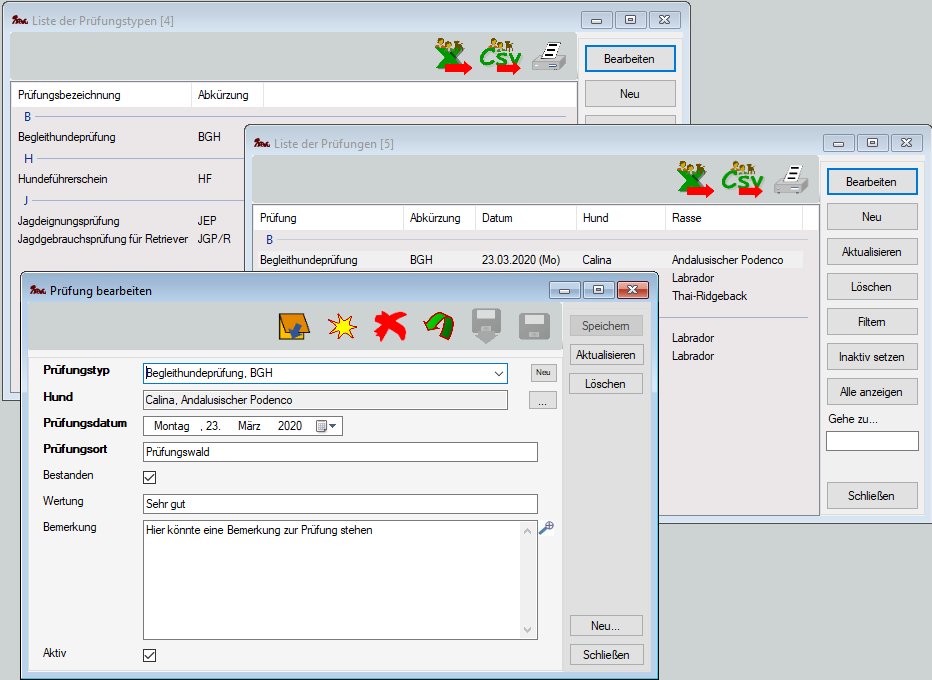 Zur Dokumentation von bestandenen und nicht bestandenen Prüfungen eines Hundes dienen die beiden Dialoge