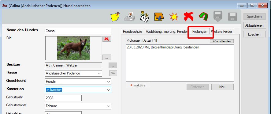 Prüfungen werden im Reiter Prüfungen in der Bearbeitungsmaske des Hundes verwaltet: