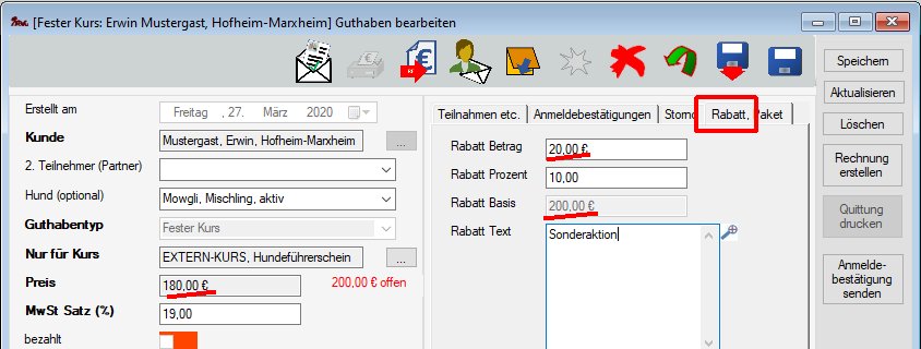 Auf alle Leistungen - Einzelstunden, Guthaben, Kleinverkäufe, Betreuungsvereinbarungen und Zusätze für Betreuungsvereinbarungen - kann ein prozentualer oder absoluter Rabatt gewährt werden. Mit dem Rabatt ändert sich der ursprüngliche Preis der Leistung. Rabatt wird bei einer Leistung jeweils in einem eigenen Reiter angegeben. Der Ausgangspreis für die Rabatt-Berechnung steht im Feld Rabatt Basis.