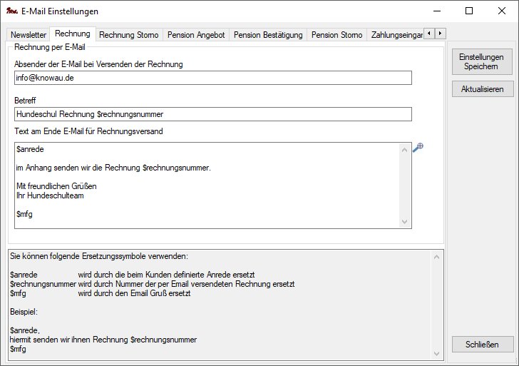Absender der E-Mail bei Versenden der Rechnung: bestimmt den Absender der E-Mail. Damit kann man eine spezielle E-Mail Adresse definieren, zu der Antworten auf gesendete Rechnungen geleitet werden.
