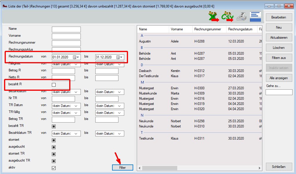 Tipp 2: Unbezahlte Rechnungen kann man über den Filtern Button rechts ermitteln: