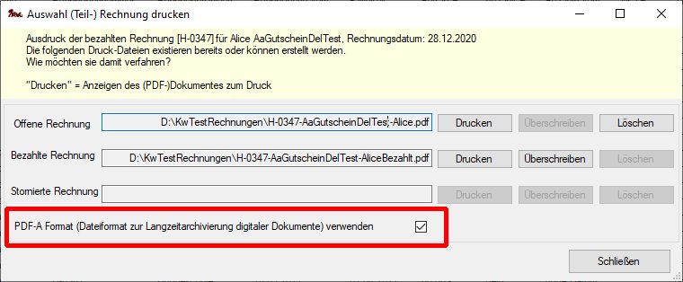 Bei Verwendung des KnoWau Word Vorlagen-Mechanismus kann optional ein PDF-Rechnungsdokument im PDF/A Format erzeugt werden. Dazu muss beim Ausdruck einer Rechnung der Haken im Feld "PDF-A Format verwenden" gesetzt werden
