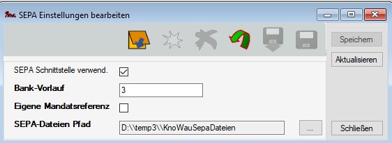Einstellungen für die SEPA-Schnittstelle erreicht man über den Dialog Sonderfunktionen->SEPA-Einstellungen.