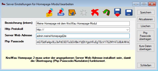 Über das Menü Homepage->KnoWau Homepage-Modul öffnet man die Liste der Server für den KnoWau Homepage-Modul.