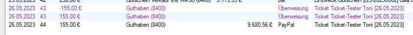 Damit stimmen die Summen in der Buchhaltung wieder. Die Bisherige Buchung (Beleg Nummer 43) ist neutralisiert und eine neue Buchung mit der Bezahlart PayPal wurde erzeugt.
