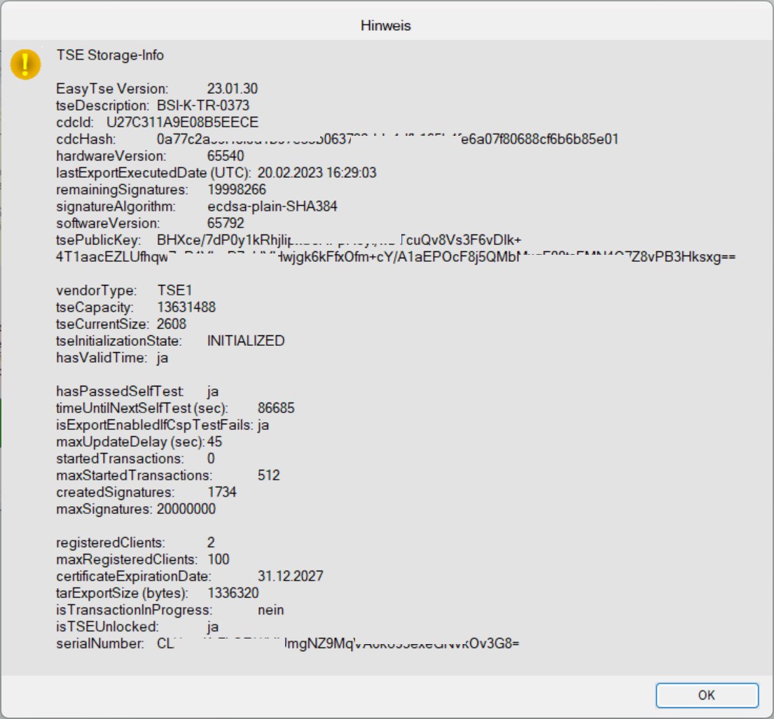 Über den Button "TSE-Info" in der Maske für den "Epson TSE-Modul Status" erhält man technische Parameter, die ggf. bei einer Fehleranylyse hilfreich sein können. Der Button ist nur bei betriebsbereitem TSE-Modul aktiviert, da die Information jeweils aktuell vom USB-Stick ermittelt wird: