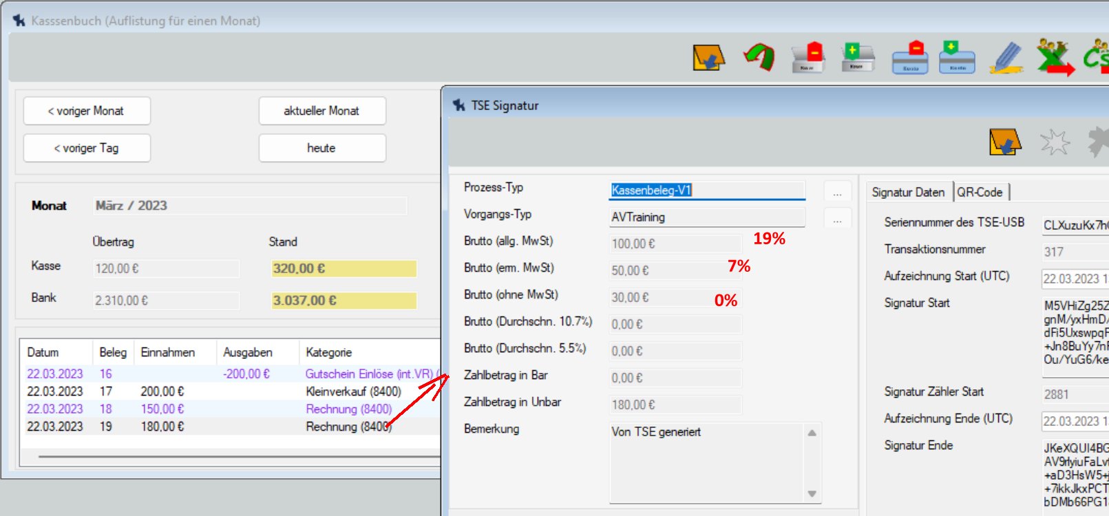 Ein Zahlungseingang von 180,- € muss auf drei Positionen gemäß deren MwSt-Satz aufgeteilt werden. Im Kassenbuch-Eintrag und in der zugehörigen TSE-Signierung wird das von KnoWau automatisch erledigt.