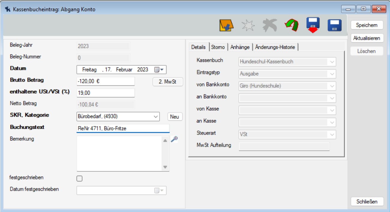 Wie KnoWau einen Kassenbuch-Eintrag bei aktivierter TSE-Kasse signiert, wird am Beispiel einer Ausgabe von 120,- € für Büromaterial erläutert: