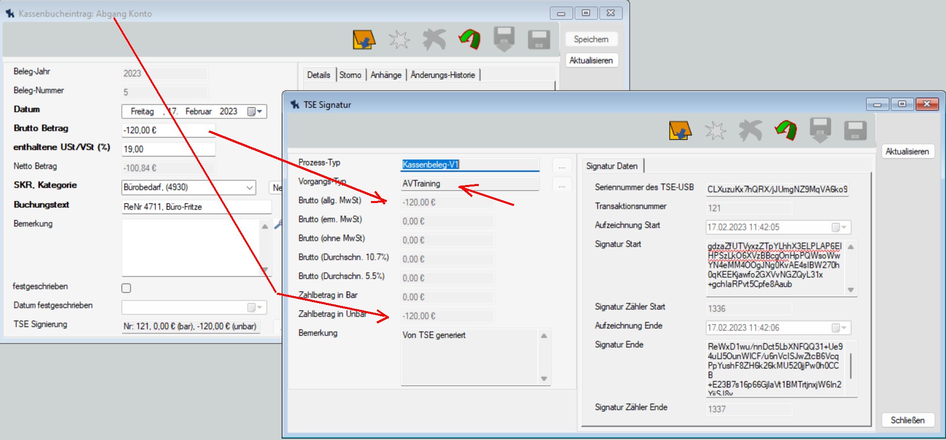 Per Doppelklick auf diesen Link gelangt man zur Anzeige der Signaturdaten. Im obigen Beispiel sieht man, dass der Konto-Abgang von 120,- € übernommen wurde und weiter unten die Ausgabe als "unbar" erkannt wird - es handelt sich um einen Konto-Abgang. Im Feld "Vorgangs-Typ" wird sichtbar, dass es sich um einen Eintrag im Trainingsmodus handelt, der bei der Buchhaltung nicht berücksichigt wird. Das liegt daran, dass der Trainingsmodus des TSE-Moduls noch nicht abgeschaltet wurde. Im rechten Bereich der Maske werdne die vom TSE-Modul erzeugten Signatur-Daten angezeigt.
