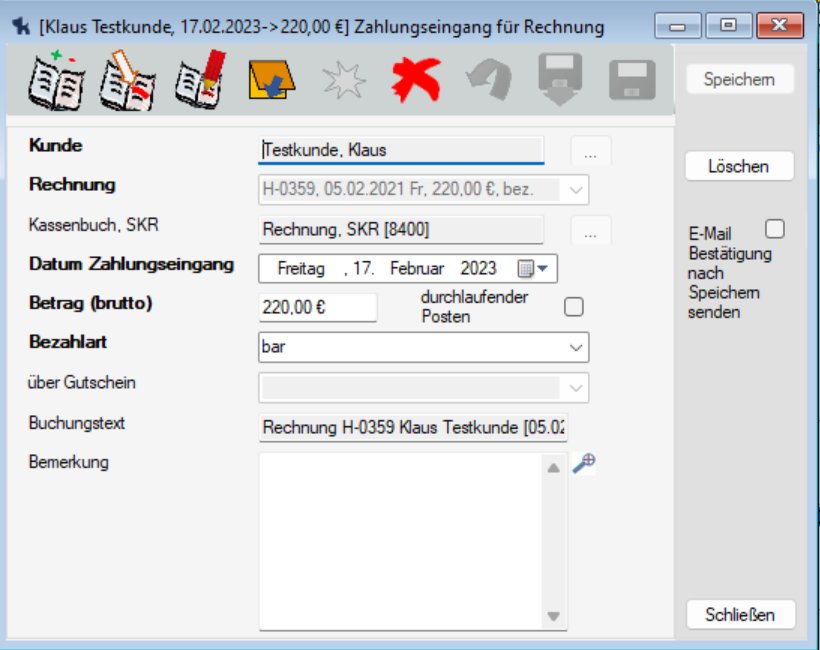 Dieser Zahlungseingang für eine Rechnung erscheint als Kassenbucheintrag mit Signierung wie folgt: