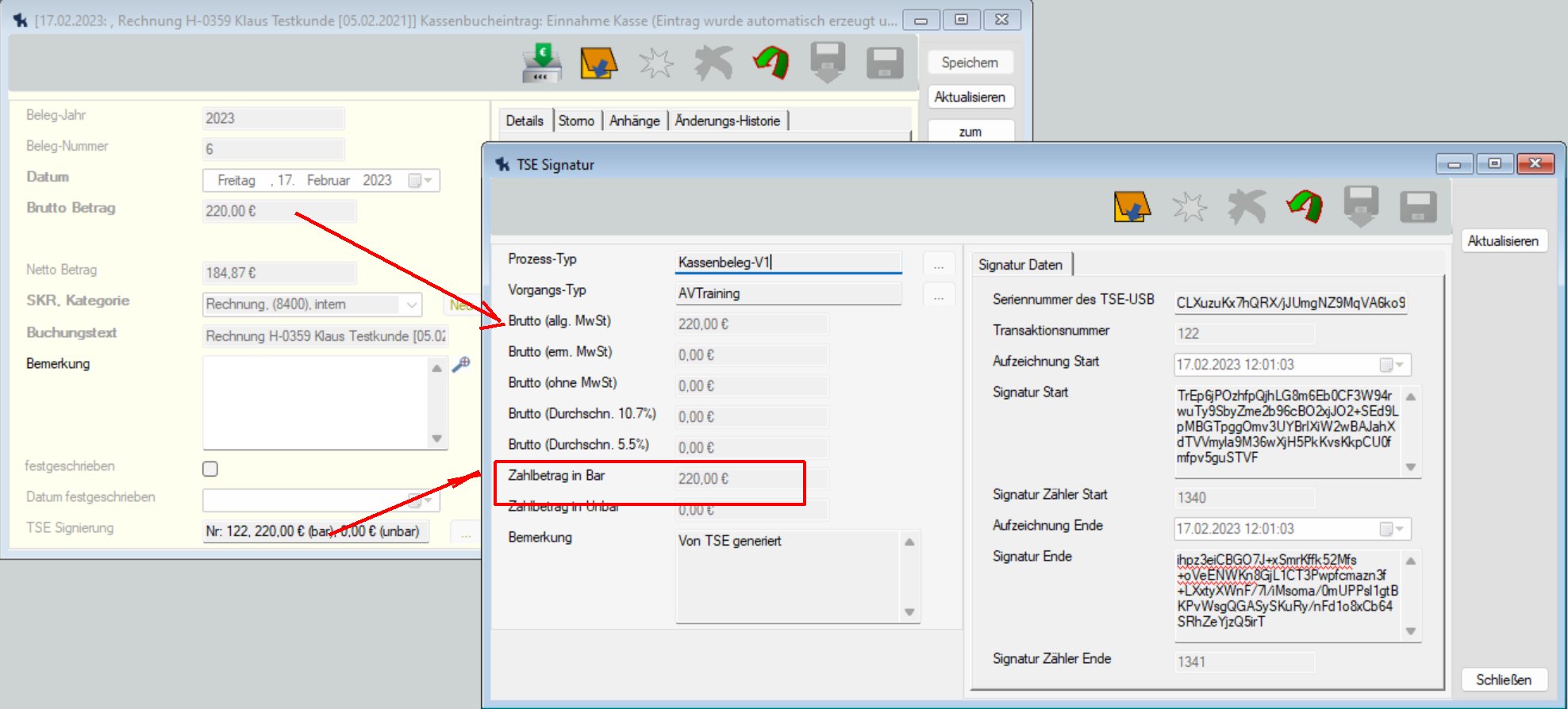 Wie KnoWau Zahlungseingang bei aktivierter TSE-Kasse signiert, wird am Beispiel eines Zahlungseingangs von 220,- € für eine Rechnung beschrieben: