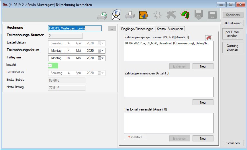 Zur Bearbeitungsmaske einer Teil-Rechnung gelangt man aus der Haupt-Rechnung per Doppelklick auf die Teilrechnung im Reiter Teilr./Erinnerg.
