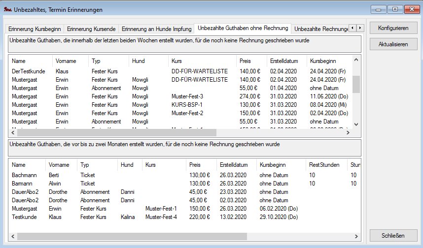 Zu den Termin Erinnerungen gelangt man über das Menü Sonderfunktionen -> Unbezahltes, Termin Erinnerungen:
