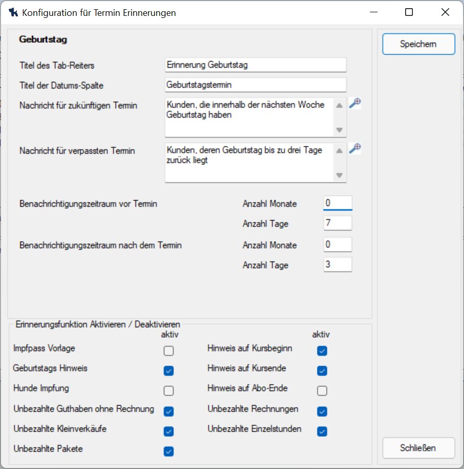 Benachrichtigungszeitraum nach dem Termin: Anzahl der Monate und Tage nach dem Termin, innerhalb derer immer noch an den verpassten Termin erinnert werden soll (hier 3 Tage nach dem Geburtstag)