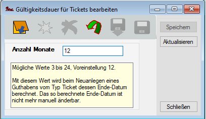 Wenn sie zum Beispiel 6 Monate verwenden, wird beim Anlegen eines neuen Ticket Guthabens gültig ab dem 23.05.2020 der Wert für gültig bis zu 22.11.2021 berechnet. Das Ticket kann nur in diesem Zeitraum verwendet werden.