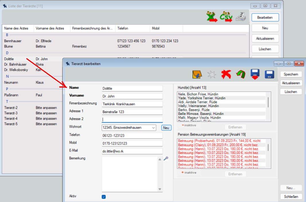 Tierärzte können einem Hund oder einer Betreuungsvereinbarung zugeordnet werden. Welche Hunde ein Tierarzt betreut oder für welche Betreuungsvereinbarungen er angegeben wurde, sieht man im rechten Teil der Bearbeitungsmaske. Per Doppelklick auf einen Eintrag gelangt man zu Bearbeitungsmaske des Hundes oder der Betreuungsvereinbarung.