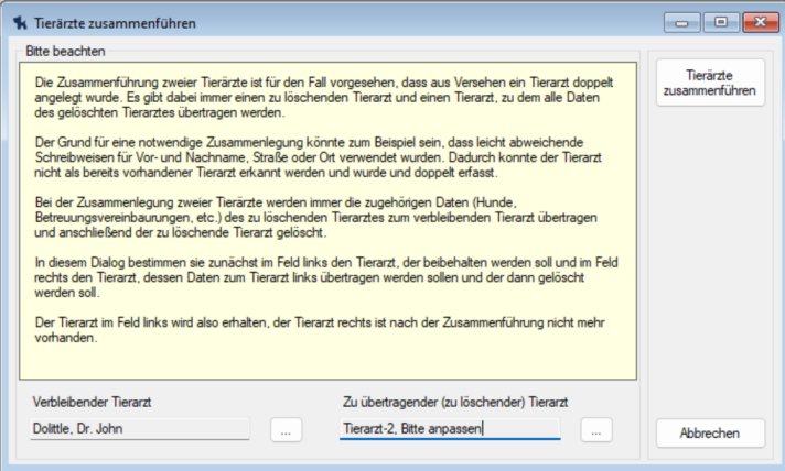 Bei der Zusammenlegung werden immer die zugehörigen Daten (Betreuungsvereinbarungen, betreute Hunde etc.) des zu löschenden Tierarztes zum verbleibenden Tierarzt übertragen und anschließend der zu löschende Tierarzt gelöscht.