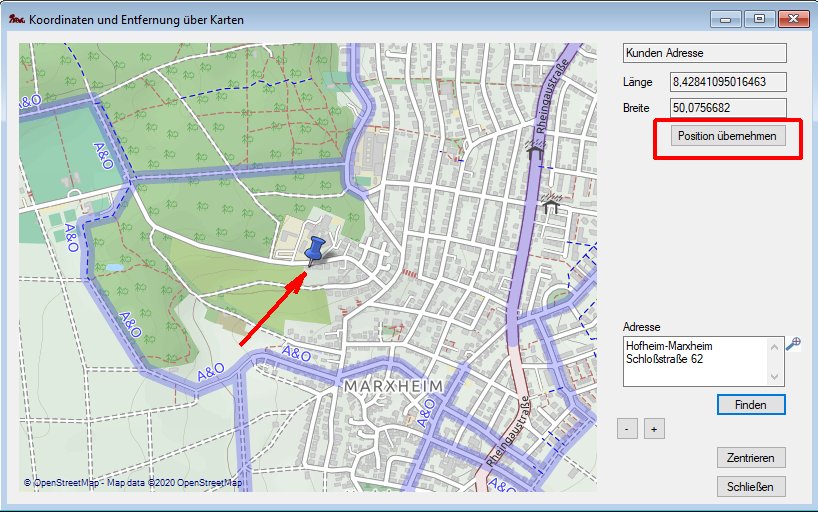 Geografische Koordinaten der Adresse (Wohnort, Straße Hausnummer) über den Kartendienst ermitteln. Bei Klick auf den Button Position übernehmen werden die Koordinaten in die Bearbeitungsmaske des Trainers übernommen..