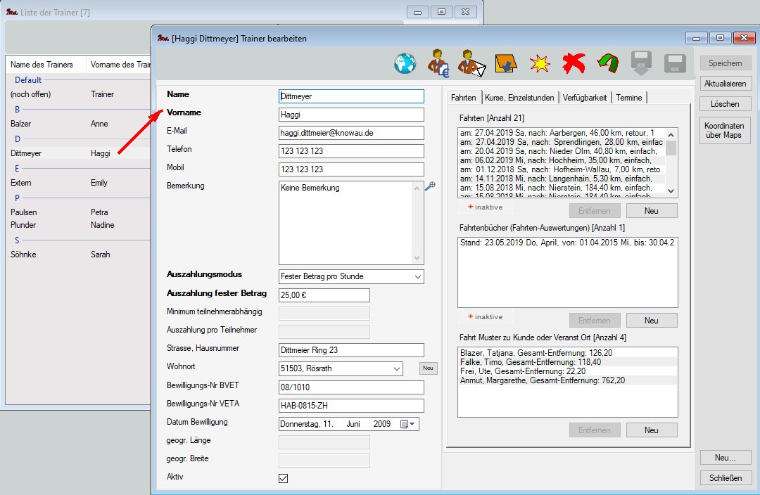 - Fahrten: Liste der Fahrten, die für diesen Trainer eingetragen wurden