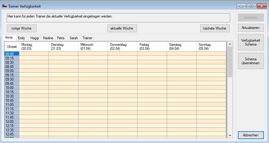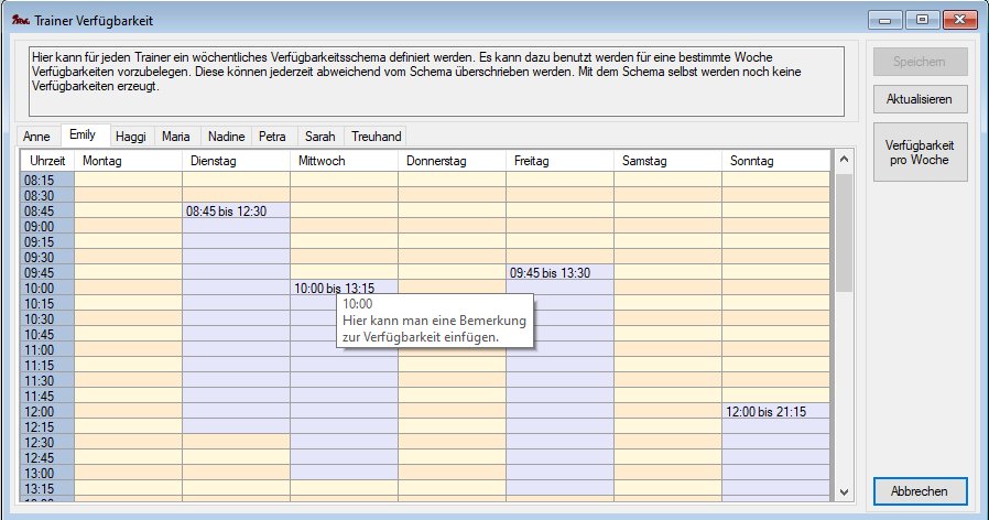 - Menü Verwaltung->Trainerverfügbarkeit öffnet Maske zur Trainerverfügbarkeit für die aktuelle Woche,