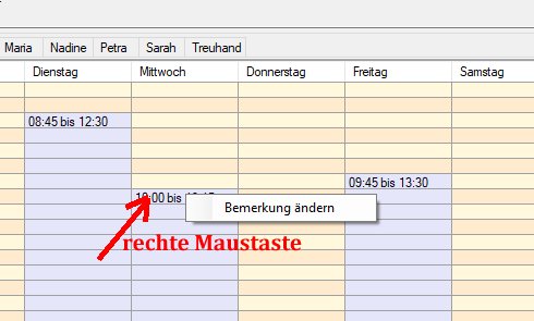 Zu jedem Eintrag der Trainer-Verfügbarkeit kann ein Text erfasst werden, in dem man zusätzliche Informationen erfassen kann. Man sieht den Text beim Überstreichen das obersten Feldes eines Verfügbarkeitsbereichs. Den Text kann man per Klick mit der rechten Maustaste ändern: