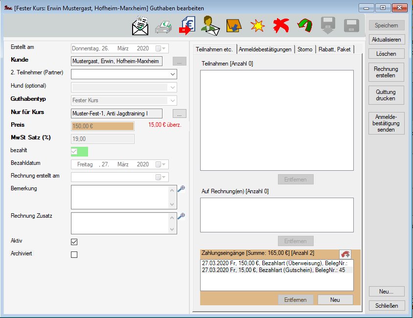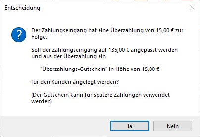 Anmerkung: Es wird empfohlen, keine Überzahlungen zuzulassen. Beim Speichern von Zahlungseingängen, die eine Überzahlung verursachen würden, hat man die Option, automatisch einen Gutschein in Höhe der Überzahlung erstellen zu lassen,