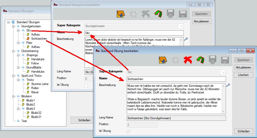 Per Doppelklick kann man die Bearbeitungsmasken der Kapitel oder Übungen öffnen. Kapitel heißen in der Maske Kategorie
