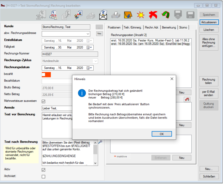 - Den Preis einer Rechnungsposition kann man direkt bei der Position (zum Beispiel Einzelstunden, Guthaben, Kleinverkauf, etc..) ändern. Nach dem Speichern der Preisänderung wird man darauf aufmerksam gemacht, dass sich der Rechnungsbetrag geändert hat – und nach dem Öffnen der Bearbeitungsmaske der Rechnung korrigiert man den Preis über den Preis aktualisieren Button
