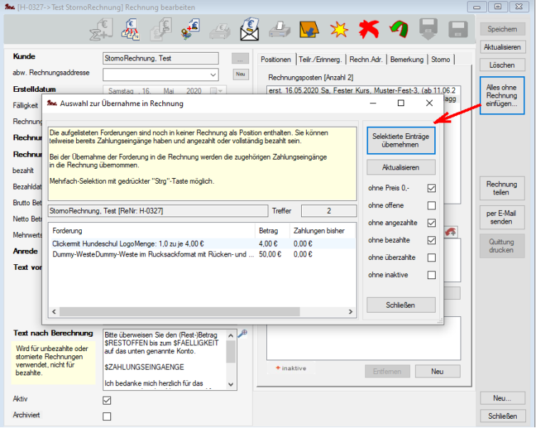 - Weitere Forderungen an den Kunden kann man in eine bereits erstellte (noch nicht bezahlte) Rechnung aufnehmen, indem man den Button Alles ohne Rechnung einfügen.. klickt. Man erhält eine Liste aller Forderungen an den Kunden, für die noch keine Rechnung erstellt wurde