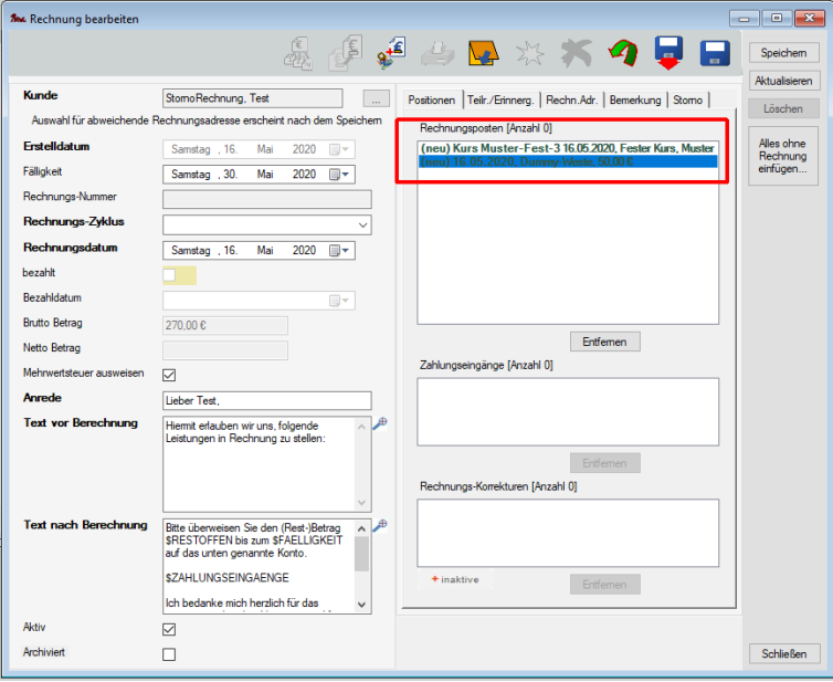 - Eine Position aus einer vorhandenen Rechnung kann man entfernen, indem man die zu entfernende Position selektiert, die Entf Taste drückt und die Rechnung speichert. Der Preis wird nach dem Speichern angepasst.