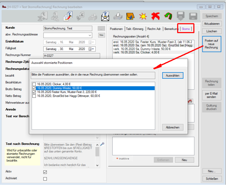 - In der Bearbeitungsmaske einer stornierten Rechnung gibt es den Button Posten auf neue Rechnung