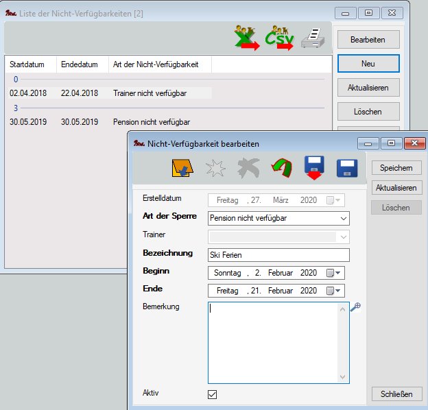 Um zu verhindern, dass sie während ihres geplanten Urlaubs oder des Urlaubs eines Trainers versehentlich Veranstaltungen planen oder Pensionsgäste annehmen, können sie Nicht-Verfügbarkeits-Zeiträume definieren. Dabei unterscheidet man drei Arten von Nicht-Verfügbarkeit: