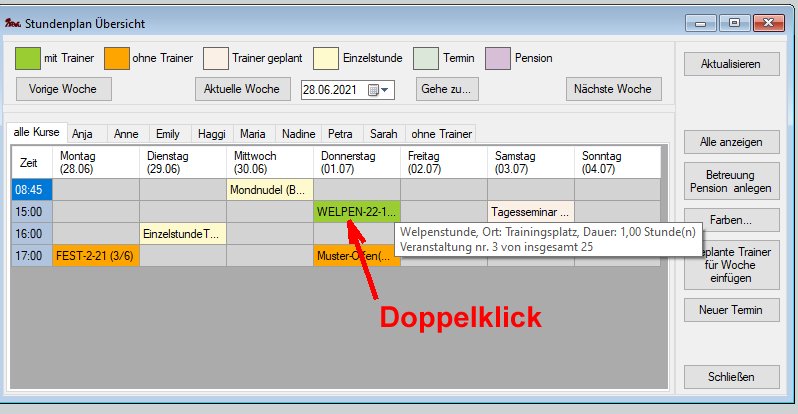 Zum Öffnen der Bearbeitungsmaske einer Veranstaltung genügt ein Doppelklick auf den Eintrag im Stundenplan.