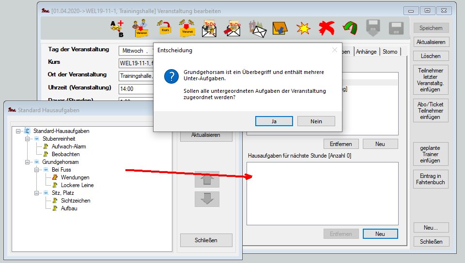 Anmerkung: es werden nur Hausaufgaben übernommen, keine Überbegriffe. Im obigen Beispiel wird Grundgehorsam gezogen, es werden aber nur die Unterpunkte mit dem Hundesymbol übernommen (Wendungen, Lockere Leine, Sichtzeichen, Aufbau).