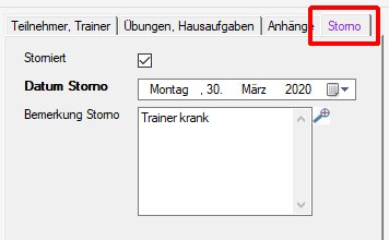 - Falls eine Veranstaltung ausgefallen ist, kann dies im Reiter Storno dokumentiert werden. Veranstaltungen, für die bereits Teilnehmer eingetragen wurden, können nicht mehr storniert werden.