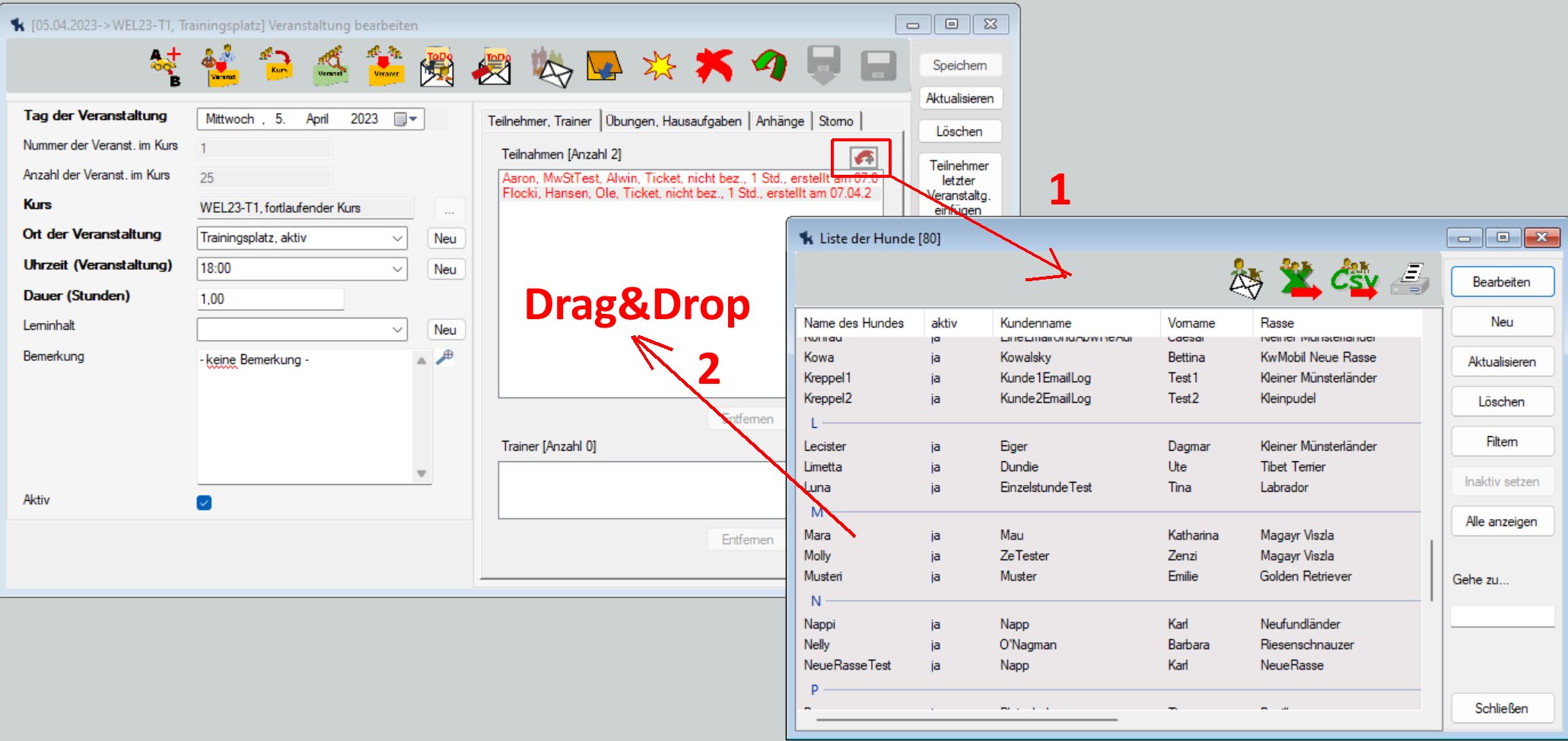 Damit wird die Liste der Hunde geöffnet und man kann per Drag & Drop den gewünschten Hund in den Teilnahmen-Bereich ziehen: