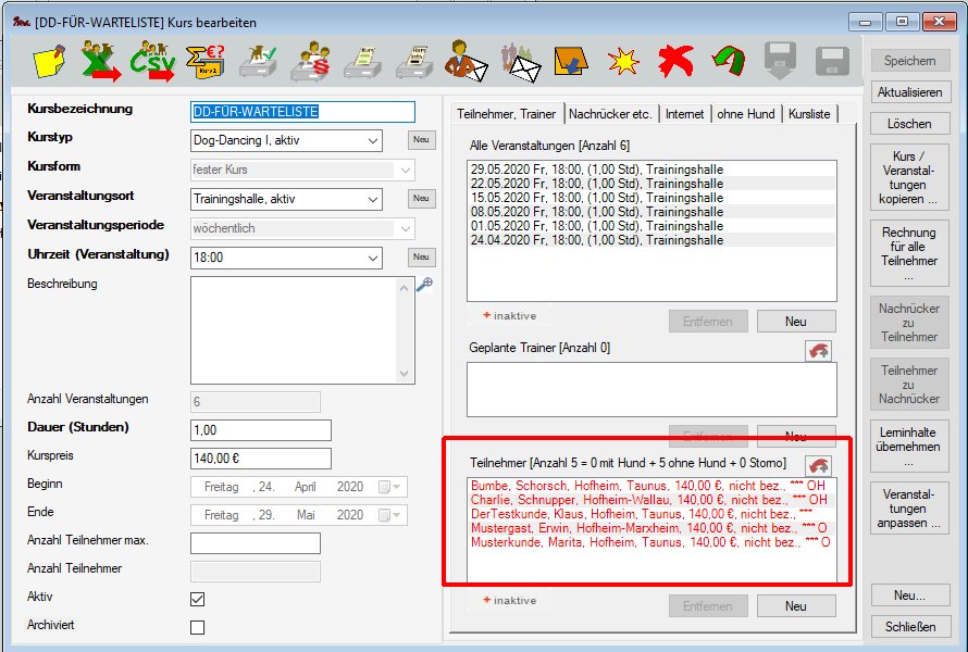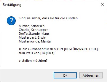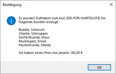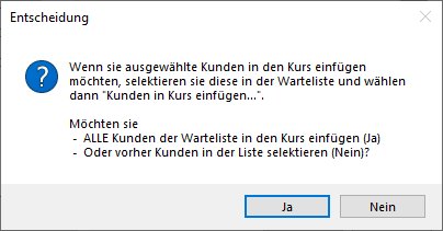 Anmerkung: Man kann nur alle oder keinen Kunden der Warteliste in einen Kurs übernehmen. Bevor sie diesen Button klicken, sollten sie daher die Kunden aus der Warteliste löschen, die nicht in den Kurs übernommen werden sollen.