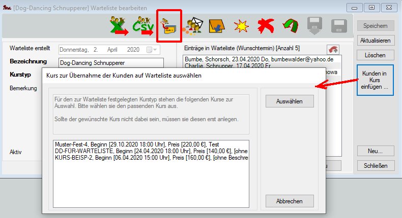auf der Bearbeitungsmaske zu einer Warteliste können die Kunden zu einem Kurs angemeldet werden.