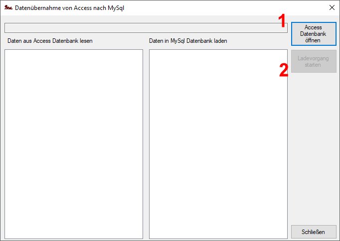 Nach Klick auf den Access Datenbank öffnen Button wählt man die Datenbank aus, die von der Einzelplatz-Variante verwendet wurde (siehe Anmerkung oben). Das Lesen der Daten aus der Access Datenbank und Einspielen in die Mysql Datenbank erfolgt nach Klick auf den Ladevorgang starten Button.