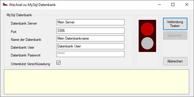 Man kann - nach Bestätigung der Abfragen - von der Einzelplatz-Variante zur netzbasierten Variante wechseln, indem man die Zugriffsdaten zur MySql Datenbank angibt: