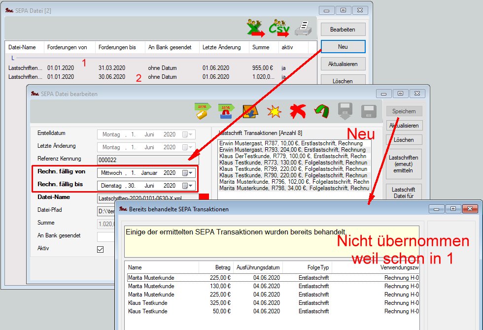 Weitere SEPA-Lastschrift-Dateien können wie die erste erstellt werden. Die Angabe in den beiden Feldern Rechnung fällig von und Rechnung fällig bis kann erneut frei gewählt werden. Überschneidet sich der zeitliche Rahmen einer SEPA-Datei mit einer zuvor erstellten, werden Transaktionen nicht übernommen, die bereits in einer zuvor erstellten Datei enthalten sind.