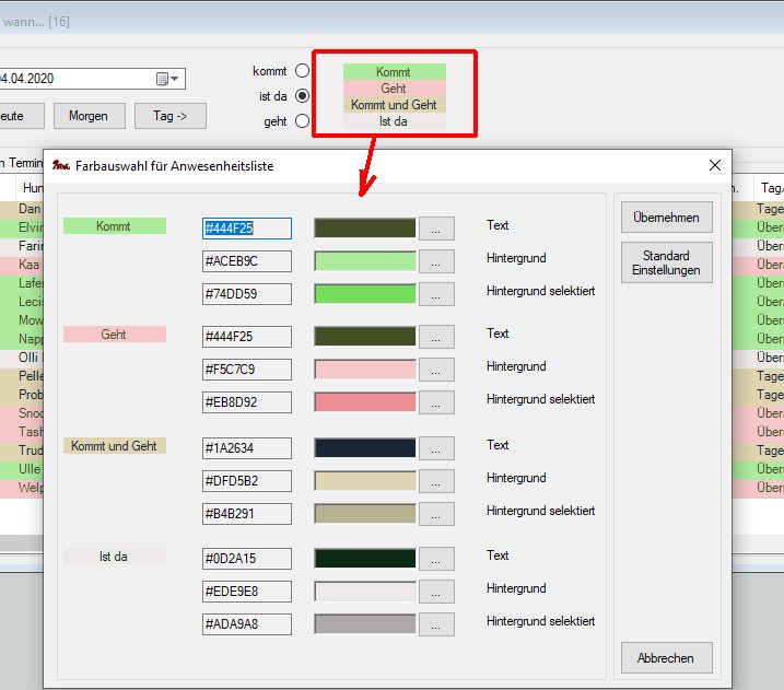 Um die Farbeinstellung der Wer kommt/geht Liste zu konfigurieren, klickt man auf die Farb-Erläuterung im oberen Bereich der Wer kommt/geht Maske: