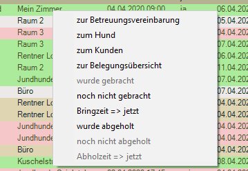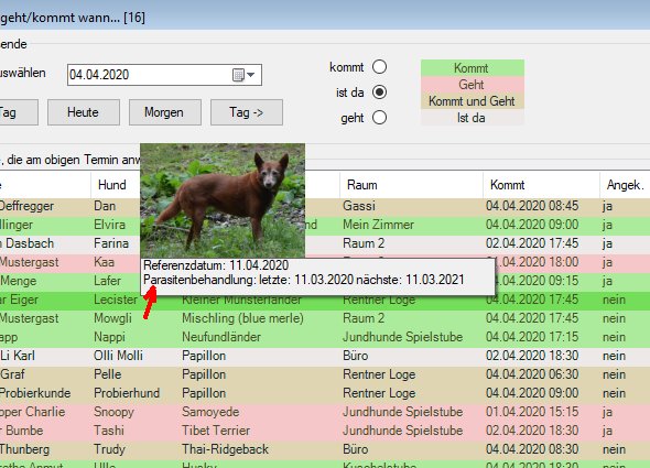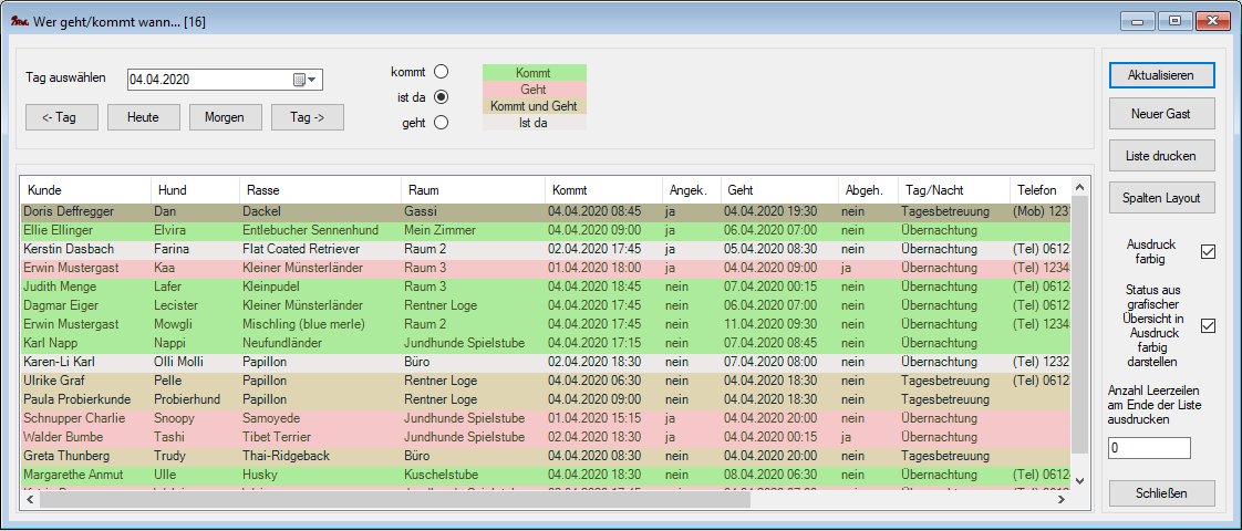 Über das Menü Hundeschule->Wer kommt/geht wann erhält man eine Liste der Gäste, die an einem bestimmten Tag in die Pension gebracht oder abgeholt werden und solche die bleiben.