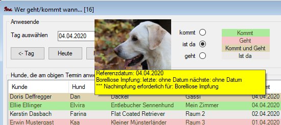 Beim Überstreichen des Hundenamens mit der Maus wird ein Bild das Hundes angezeigt (falls beim Hund vorhanden) und die Impfdaten des Hundes