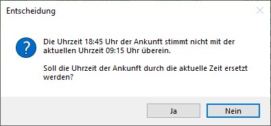 - wurde gebracht: ist aktiv, wenn der Gast noch noch nicht angekommen ist (Angek. = nein). Falls die aktuelle Zeit nicht mit der Bring-Zeit der Belegung übereinstimmt, erfolgt die Abfrage: